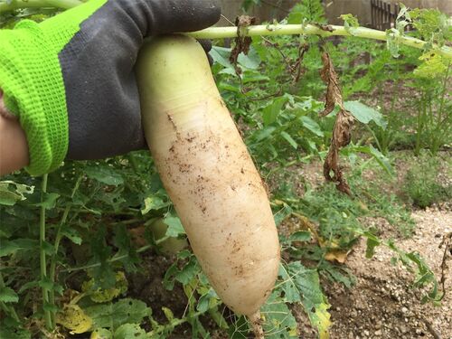 庭の隅の家庭菜園で育てていた大根を収穫した。 種を撒いて、適度に間引きしながら育てただけで立派な大根になってくれた。